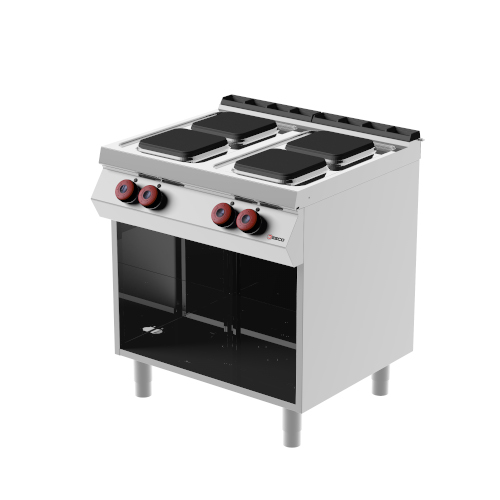 Structure completely made of stainless steel with flush joints, moulded tops and rounded edges. Models with 4x 2,6 kw cast iron plates operated by a 6-position switch, available on open compartment, with hinged doors or on 2/1 4.6 kW static electric oven. Separate controls for each plate.