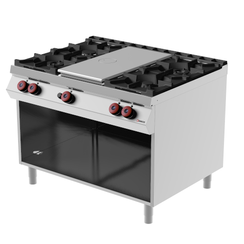 Available in 9 gas models: on open compartment, with hinged doors, with gas oven and with 2 burners on gas oven or gas oven and hot cabinet. The cooking plate is entirely made of extra-thick heat-diffusing steel, with a removable central insert. The differentiated thermal areas with the maximum temperature in the middle, decreasing towards the outside, allow different types of cooking.