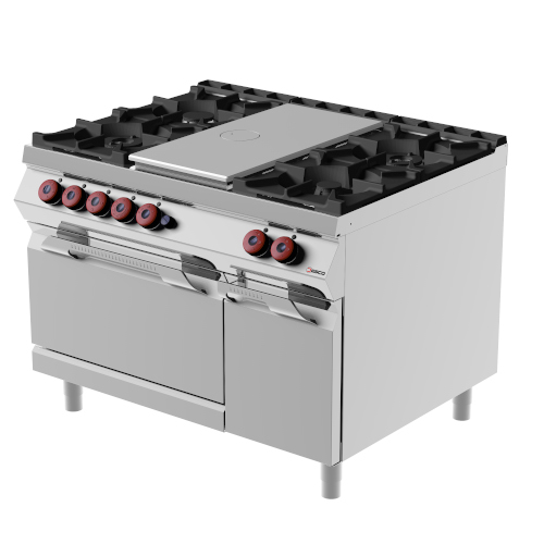 Available in 9 gas models: on open compartment, with hinged doors, with gas oven and with 2 burners on gas oven or gas oven and hot cabinet. The cooking plate is entirely made of extra-thick heat-diffusing steel, with a removable central insert. The differentiated thermal areas with the maximum temperature in the middle, decreasing towards the outside, allow different types of cooking.