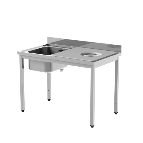 - Plan de travail en acier avec dosseret ép. 40 mm Dosseret h 100 mm Avec cuve à droite, trou-dechets à gauche et planche à découper en polythène Disponible également la version avec des pieds ronds 1x bruciatore in ghisa Ø130 mm